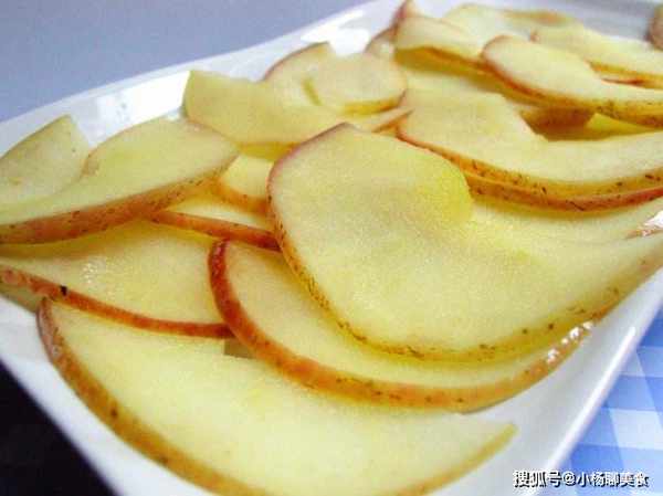 烹飪技巧1:先將蘋果去掉皮,將蘋果切成塊,裝盤後備用,將山藥去掉山藥皮,將山藥切成長條備用。