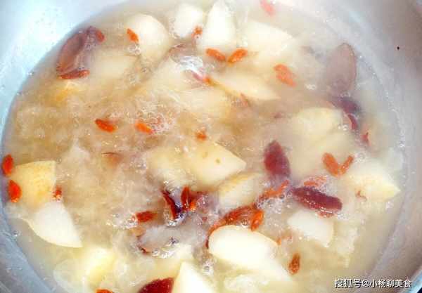 第二步:然後我們將雪梨清洗乾淨,可去皮可不去皮,切成塊,放到鍋裏和銀耳同煮大約20分鐘,然後再加入洗乾淨的枸杞和冰糖,熬煮至冰糖融化,關火再燜幾分鐘即可出鍋。