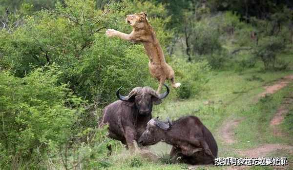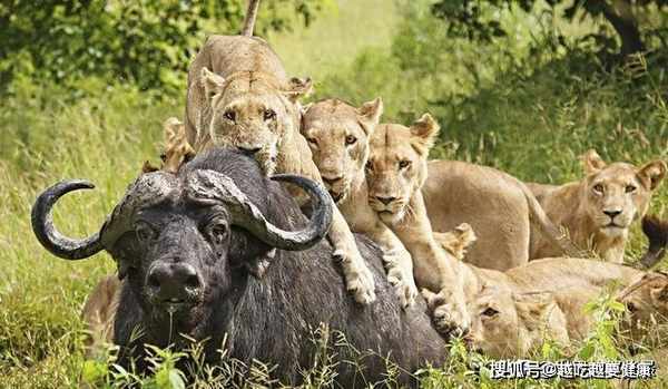 通常一群雌獅對付一頭野牛的時候,都沒有討到什麼便宜,而非洲野牛也是殺死獅子最多的一種動物,雖然獅群的主要食物是野牛,但通常捕獵的對象是野牛幼崽,而強壯的成年野牛,即便是雄獅也不敢輕易下手。在看紀錄片的時候,雖然大多數時候都是獅群捕殺了野牛,但是很多情况下也可以看到獅子被野牛反殺,這就說明,野牛的實力不會在獅子之下。