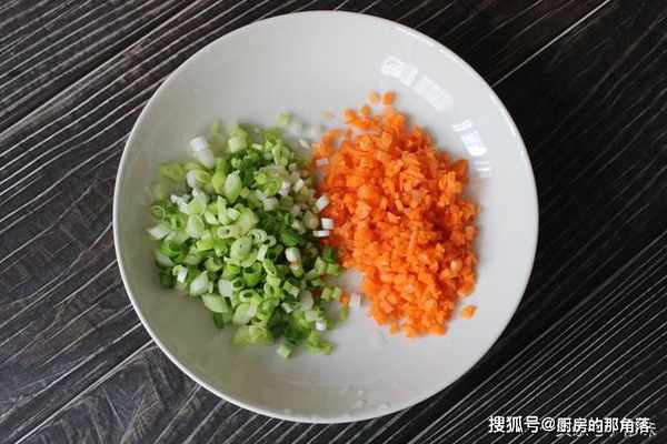 1.小葱切成蔥花,胡蘿蔔切成碎丁,越碎越好。