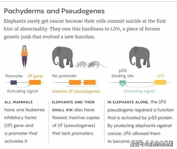 2015年,美國科研人員在大象體內發現的"僵屍基因"具有抑制抗癌功效。這種僵屍基因不僅能够識別體內無法修復的DNA,還能够降低細胞的癌變率。這種抑制癌細胞發生的僵屍基因在大象體內存在很多,而人類體內的基因卻只有一個,這也是為何大象癌變率會低於人類的原因,美國科研人員通過這項實驗研究證明了,在僵屍基因中,有一種扮演著超級狠角色"藝員款"基因,它具有抗癌作用。