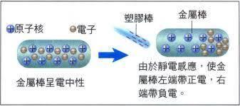 ,導致同種電荷相互排斥,异性電荷相互吸引,導致導體中的正負電荷分離,形成帶電體。其中電子集中的一段就會形成負電,另一端因為缺少電子而形成正電(電子帶負電荷),這就是
