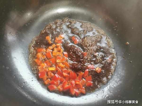6、接下來我們把盤子中的水分倒進鍋中,開火燒開,放入紅彩椒。