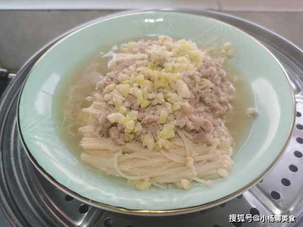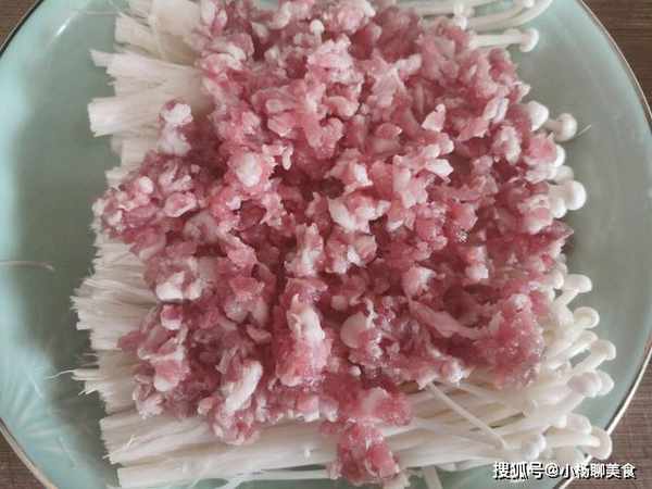 2、準備一些肉末,肥瘦相間的那種,雖然現在猪肉比較貴,但是該吃還是要吃呀,把肉末均勻地鋪在金針菇上邊。