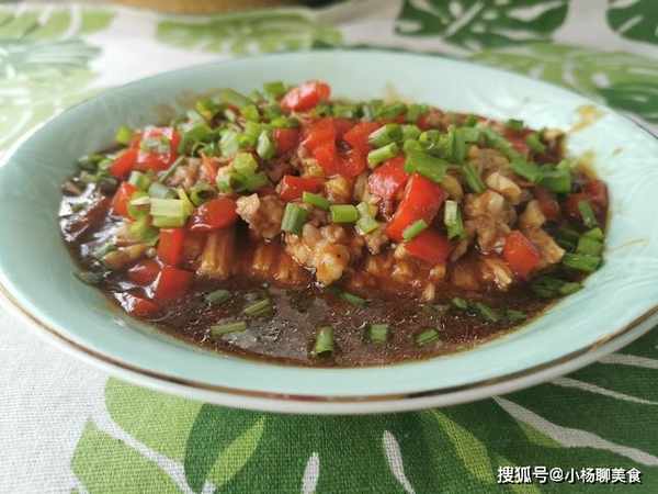 4、把炒好的蒜末連同油,一起倒在肉末上邊,平鋪均勻,然後放進蒸鍋中蒸大約10分鐘。