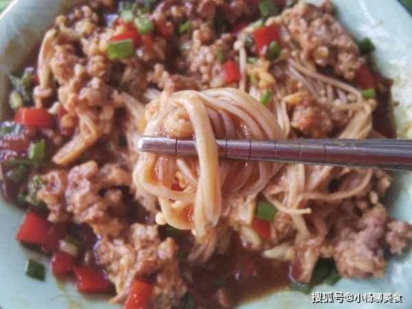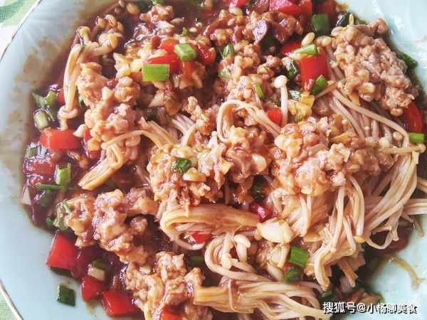 食材準備:金針菇,肉末,蒜末,紅彩椒,葱末,食鹽,五香粉,生抽,醬油,黃豆醬,雞精,水澱粉