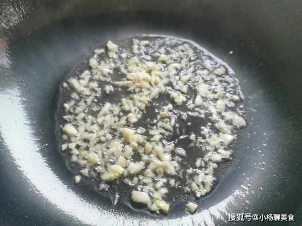 3、炒鍋中倒入適量食用油,油熱之後,放入蒜末炒出香味。