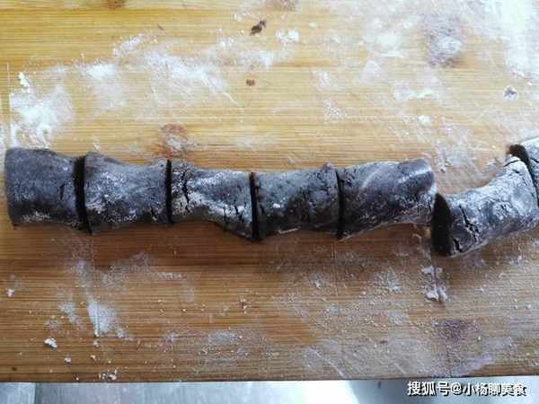 3、準備60克的豆沙餡,用適量麵粉或者糯米粉搓成長條,分大小均勻的劑子。