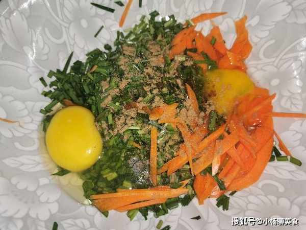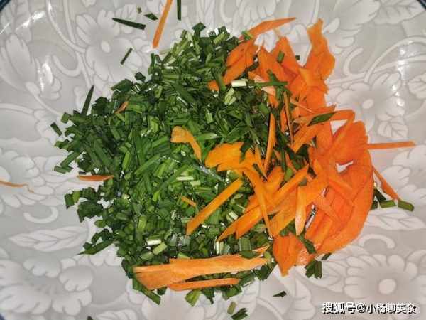 1、首先我們準備一小把韭菜,洗淨切成碎末,裝入大盆中。接著準備一根小一點的嫩胡蘿蔔,切成細絲狀,和韭菜放在一起。