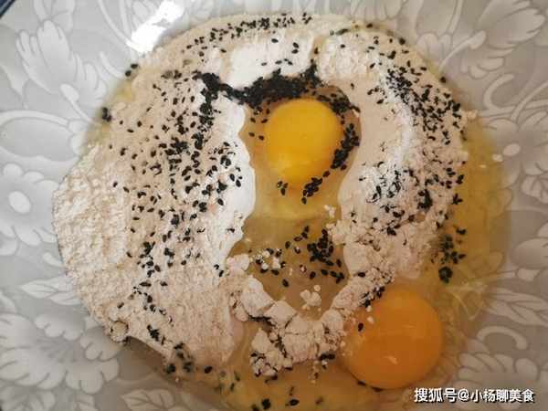 1、首先我們來和麵,在盆中加入200克的普通麵粉,打入2個雞蛋,再加入適量的黑芝麻。