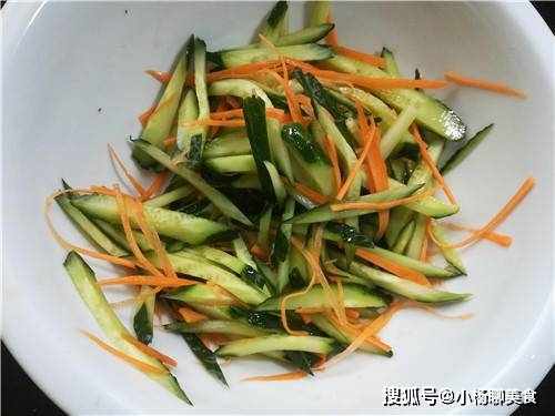 步驟2:拿出黃瓜並且將黃瓜用清水搓洗一下,接著將黃瓜的頭和尾都切掉,然後將黃瓜先切成片,接著將黃瓜改刀切成絲,放在一旁。然後拿出胡蘿蔔,將蘿蔔洗一下,洗乾淨之後就將胡蘿蔔切成絲,並且將胡蘿蔔和黃瓜放在一起,並且在碗中加上一點點鹽拌勻後醃制5分鐘。最後洗上一點蒜,清洗乾淨後切成蒜末。