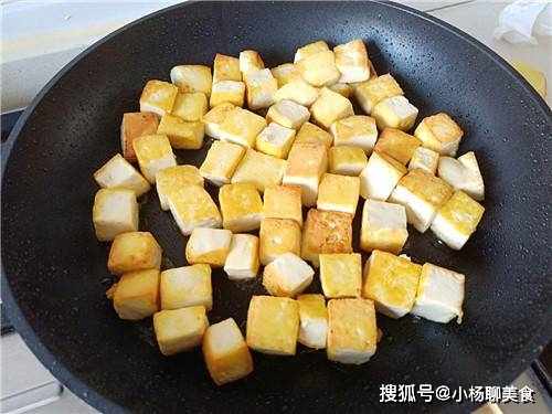 步驟2:將豆腐從水中撈出,接著將豆腐用刀切成帶下差不多的小塊,然後開始煎。在鍋內倒入適量油,燒熱之後就將豆腐下鍋擺好,接著開始煎,煎的時候用鍋鏟或者筷子輕輕的翻面,直到每一面都被煎到兩面金黃,然後就可以關火,並且將豆腐放在碗中備用。