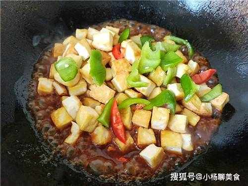 步驟3:在鍋內倒入油,等到油燒到微熱之後就將醬汁下鍋,接著用勺子攪拌鍋中的醬汁,直到醬汁開始起泡,這時候就可以將豆腐下鍋,並且放上辣椒,然後用鍋鏟翻動豆腐,讓豆腐均勻的裹上醬汁,等到裹均勻之後就可以關火,將豆腐出鍋,最後撒上蔥花就可以吃了。