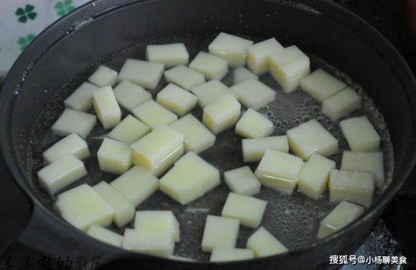 製作步驟1:將2塊米豆腐切成塊,將米豆腐過熱水後撈出,最好是加上一些鹽,撈出後控幹其中的水分。