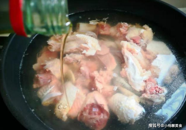 製作步驟2:將鍋中加一些清水,煮沸以後下入土雞塊一起煮,加上一勺料酒,少許生薑片,大火煮一煮,將血沫舀出來。