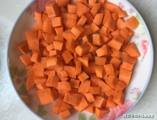 製作步驟1:將準備好的胡蘿蔔洗乾淨,將皮去掉後切成丁,將小米用清水泡2個小時。