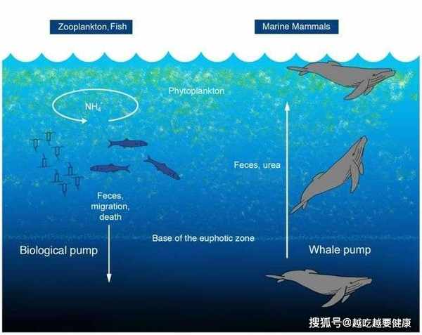 。鯨魚雖然是哺乳動物,但它們的糞便並不像陸生哺乳動物一樣是固體,而是飛絮狀。飛絮狀的糞便中富含鐵、磷、氮等大量的營養物質,而這些物質又是浮游植物所