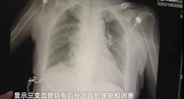 經過一系列檢查,這些患者已經明顯出現急性的廣泛前壁心肌梗死,隨後醫生又給患者進行了急性冠脈造影檢查,顯示三支血管均有百分之百的狹窄和閉塞。