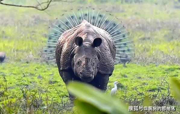 原來,攝影師在印度西孟加拉邦的Gorumara國家公園進行拍攝時,偶然的一隻犀牛走到了一隻正在開屏的孔雀前面,而攝影師的角度正好會看到一個錯覺,覺得是犀牛在開屏了。