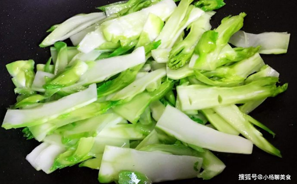 製作步驟2:將兒菜去掉最外面一層,將裡面的肉切成片,將兒菜在熱水焯水幾分鐘,將兒菜撈出過冷水。