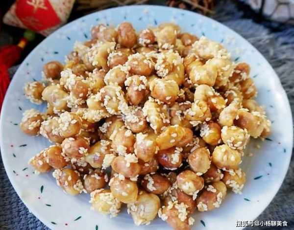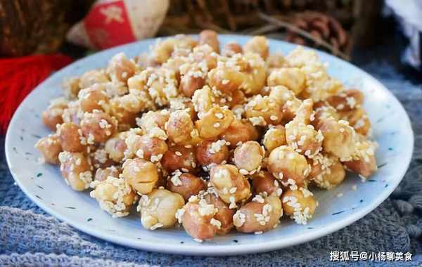 製作食材:準備500克花生,澱粉少許,雞蛋3個,白芝麻少許,白糖少許,食鹽少許。