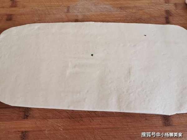 5、麵團發酵好之後,取出來揉搓排氣,用擀麵杖擀成1釐米厚的長方形大面片。