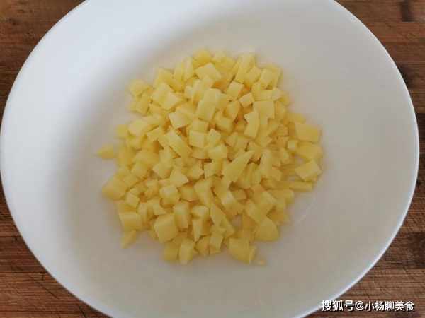 2、兩個洋芋洗淨去皮,我家的洋芋比較小,如果你家的大,用一個就可以,先切成厚片,再切成小丁狀,放入大碗中。