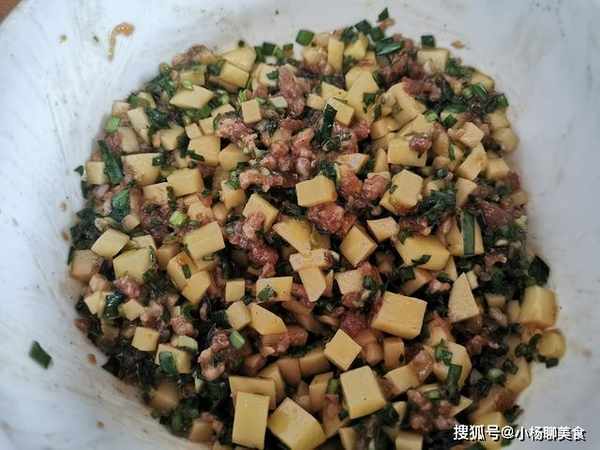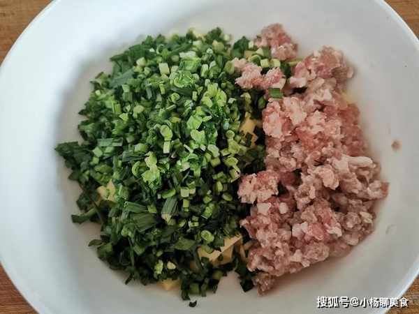 餡料準備:韭菜,洋芋,猪肉末(肥瘦相間),蔥花,薑末,花椒油,十三香,食鹽,醬油,耗油,雞精
