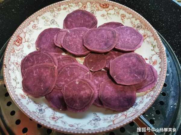 2、紫薯洗淨去皮,切成薄片,上鍋蒸熟,一般10分鐘就可以了。