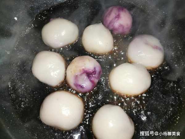 5、蒸好的紫薯糯米球,取出來,之後另取一個鍋,加入適量清水,再放入兩三勺紅糖,等到紅糖煮開的時候,放入蒸熟的糯米球,燜煮一會,到湯汁濃稠的時候,關火倒出來就可以吃了。