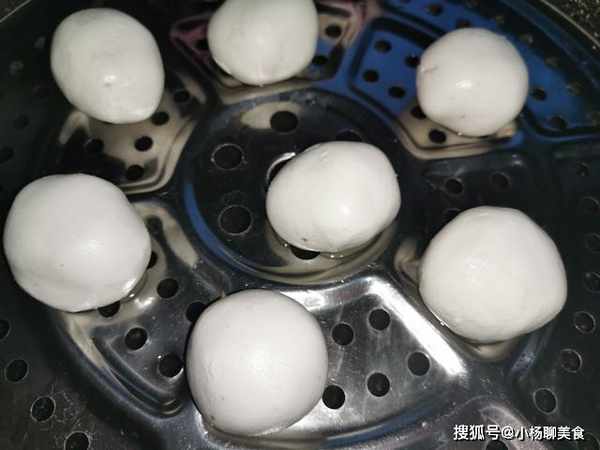 4、取適量的糯米麵團,按扁,包入適量的紫薯泥,之後封口團成圓形,全部做好之後,再放入蒸鍋中蒸10分鐘,我做的量比較少,我家只有我自己愛吃甜的,所以做的不多。