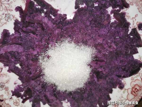 3、蒸好的紫薯,取出來,加入20克白糖,趁熱用勺子壓成細膩的紫薯泥。