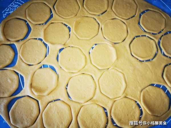 5、拿一個圓口的杯子,用杯口壓出一個個的小圓餅,邊緣的麵團重新擀開,壓成小餅。