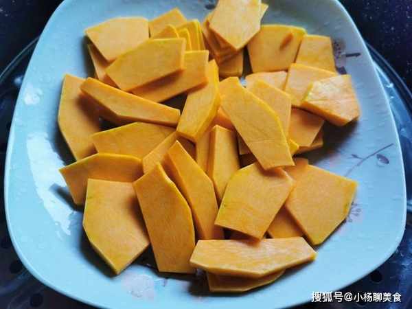 1、首先我們把南瓜洗淨去皮去瓤,切成薄薄的片,放在盤子中,再放入鍋中蒸熟,大約需要12分鐘。