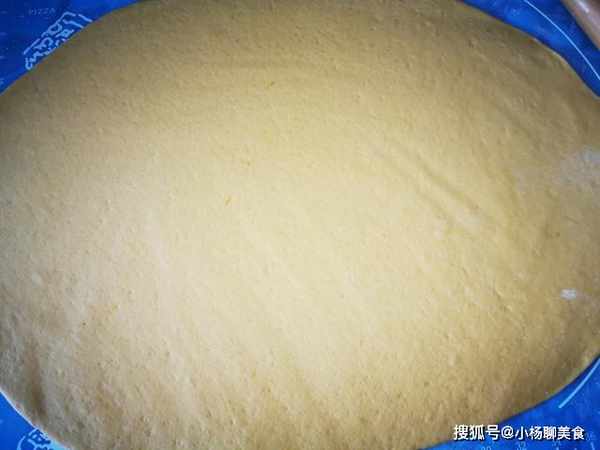 4、麵團發酵好之後,體積明顯變大,然後拿出來揉搓排氣,擀成一個厚度在1釐米的圓片。