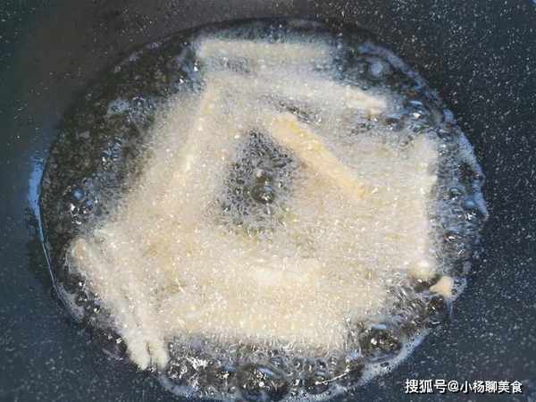 3、鍋中倒入多一些的食用油,油溫6成熱時,下入紅薯條中小火炸,炸到表面定型,而且顏色金黃就可以盛出來控油。