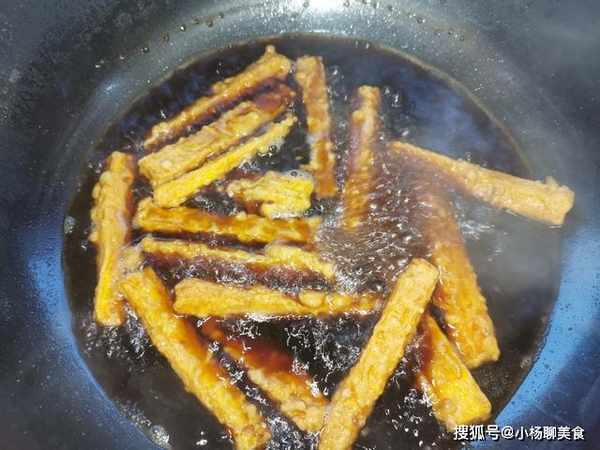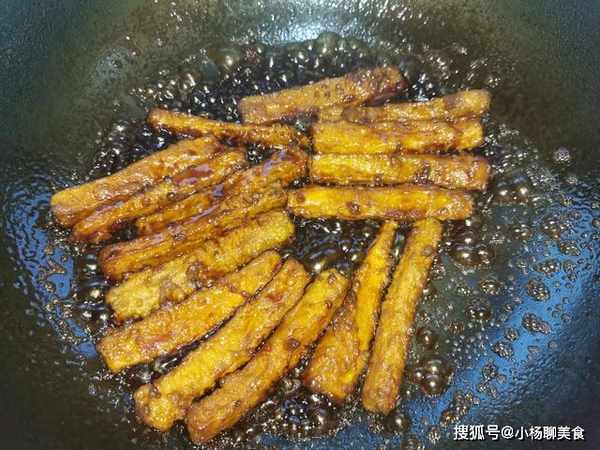5、等到鍋中的紅糖水煮開的時候,放入炸好的紅薯條,中火慢慢熬煮一會。