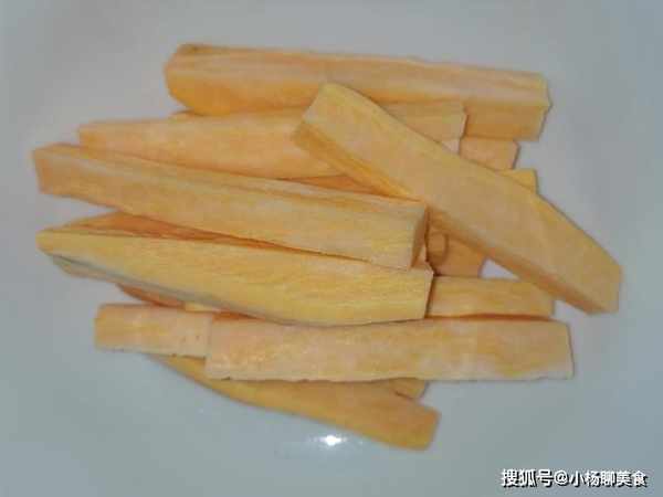 1、首先我們將紅薯去皮,切成條狀,別切得太細了,這些紅薯條大約有190克,放入大碗中。