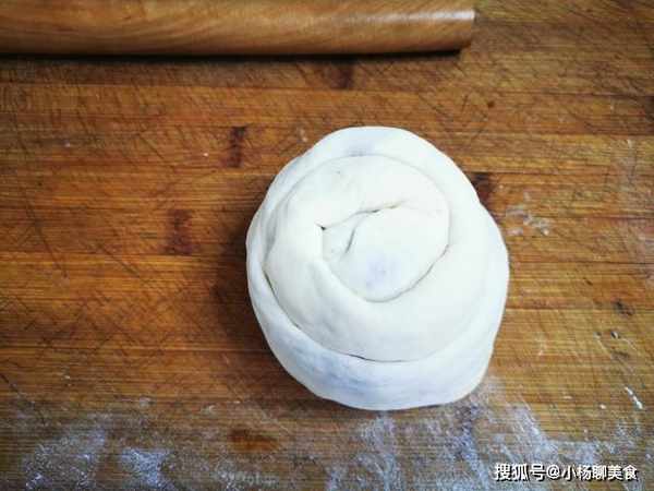 4、接著我們把面片卷成桶狀,再轉成圓形,收口處放在下邊。