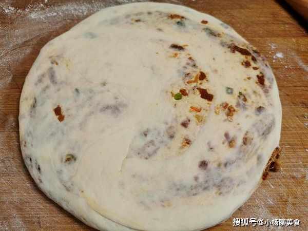 5、用擀麵杖擀開成圓形,厚度在1.5-2釐米之間,我這些量做了一張大肉餅。
