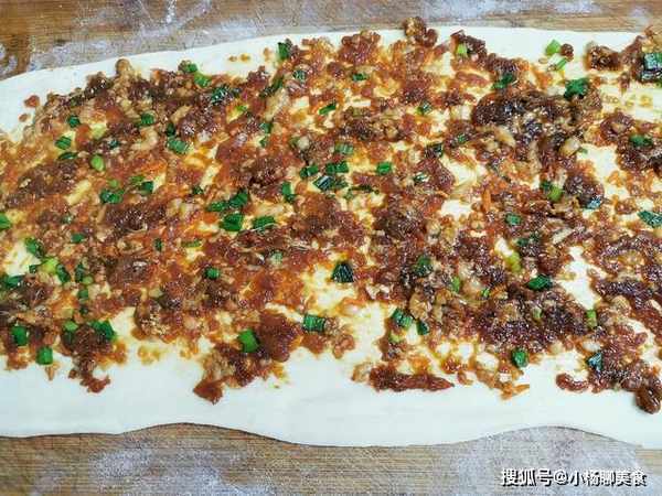 3、我們的麵團發酵好之後,拿出來放在案板上揉搓排氣,之後擀成長方形的面片,在面片上均勻的抹上肉餡。