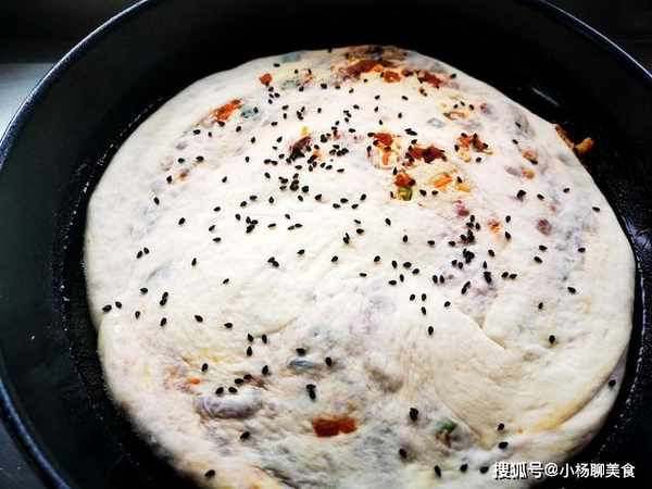 6、然後我們將平底鍋倒入油,也可以用電餅鐺,把餅胚放進來,撒上一些黑芝麻提香,開小火,蓋上蓋子慢慢烙,不要心急,反復翻面3-4次,要烙5-6分鐘,按壓之後快速回彈就是熟了。
