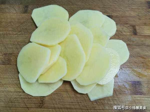 1、首先我們把洋芋清洗乾淨,之後去掉皮,切成薄薄的圓片狀。