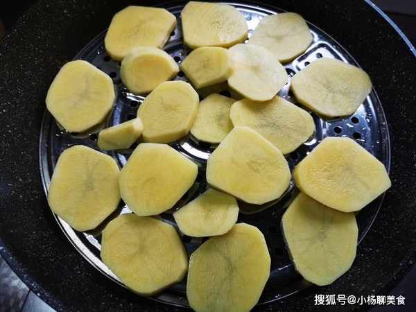 2、把土豆片,放進鍋中蒸熟,大約需要蒸10分鐘,用筷子能輕鬆紮透即可。