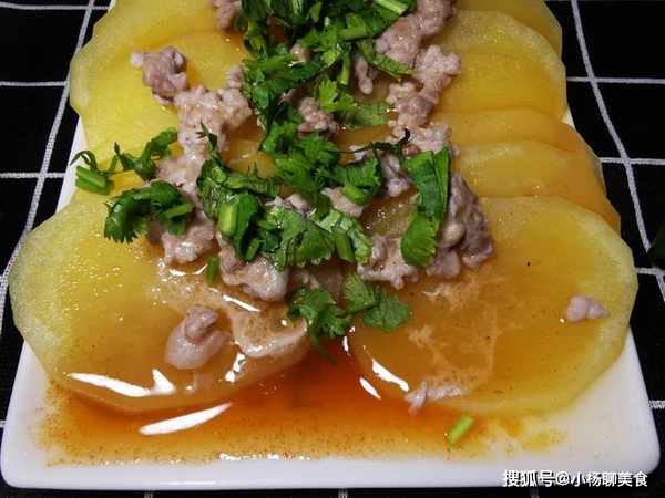 6、接下來我們把煮好的料汁,用小勺子倒在洋芋肉末上面,再撒上一些香菜末或者葱末就可以吃了,特別好吃,不用炒不用炸,營養健康又美味。