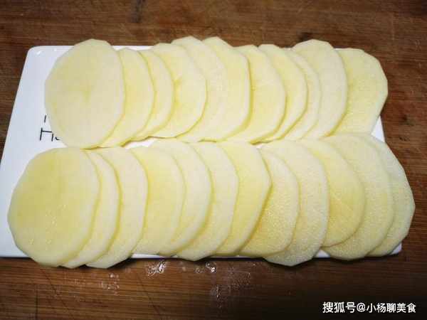 1、首先我們準備兩個洋芋,把它們清洗乾淨,用削皮器削去外皮,接著切成薄厚適中的圓片,用清水浸泡幾分鐘,洗去多餘澱粉,之後將洋芋均勻地擺在盤子中。