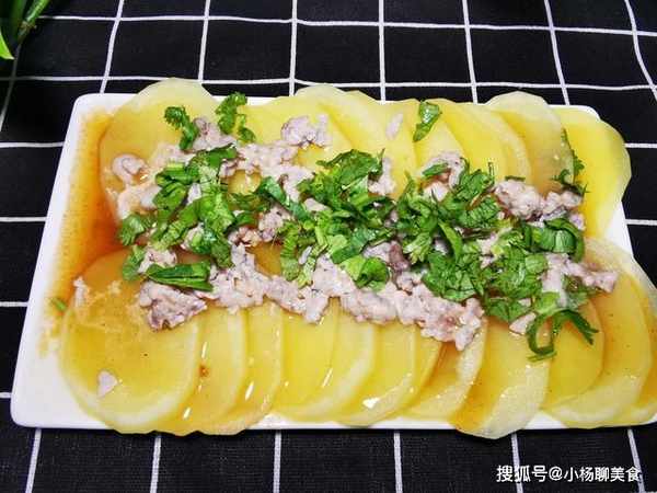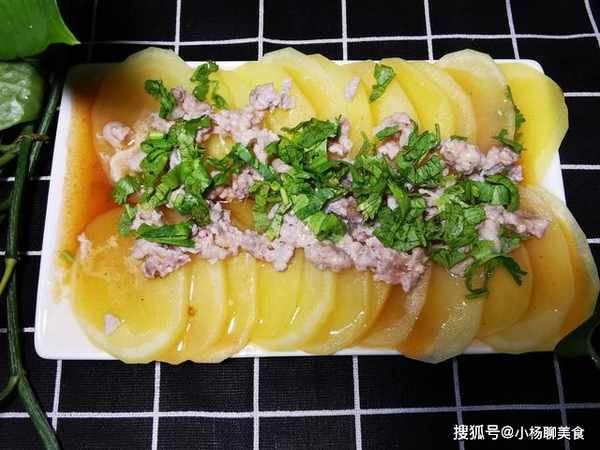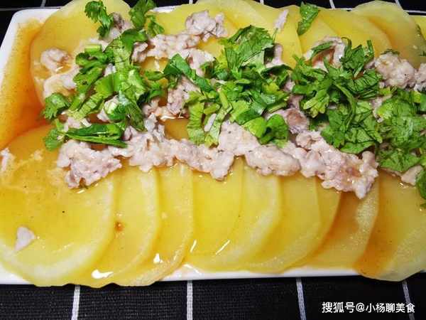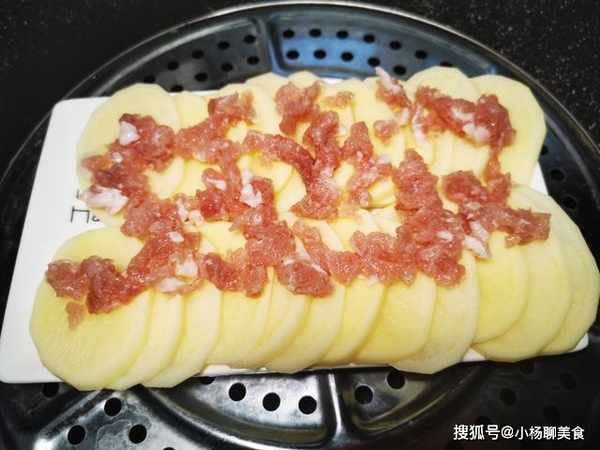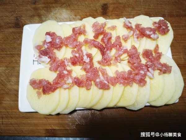 2、然後我們剁一點猪肉末,把肉末均勻撒在擺好的土豆片上面。