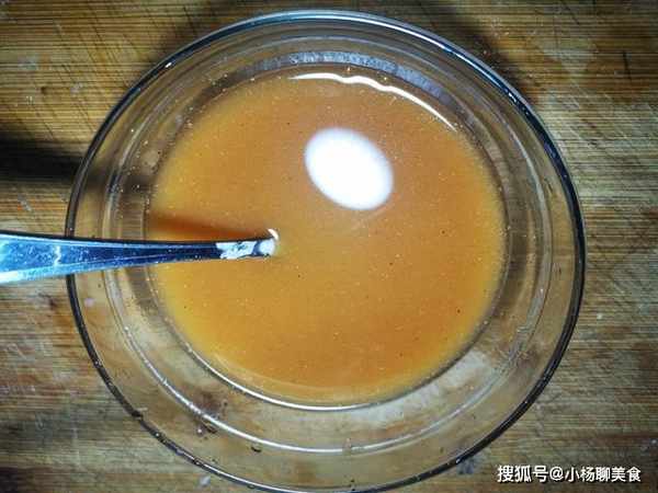 4、在蒸洋芋的時候,我們準備一個小碗,加入食鹽,生抽,耗油,白糖,雞精以及適量的番茄醬,再加入半碗清水以及適量生粉,拌勻,做為料汁使用。