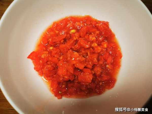 1、首先我們將蕃茄洗淨,之後在頂部開一個十字花刀,放在開水中燙1-2分鐘,這樣可以將蕃茄的皮輕鬆去掉,之後去掉蒂,把蕃茄切成碎一點的末,放入大碗中。