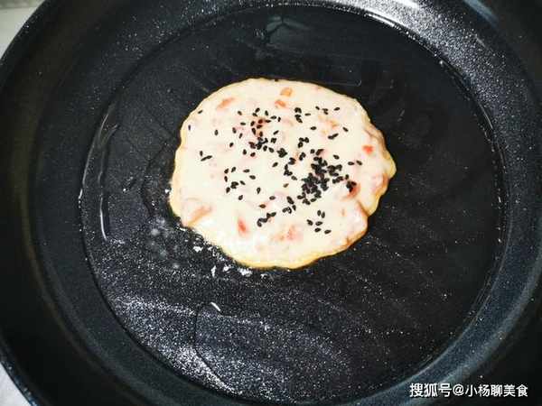 3、平底鍋中倒入食用油,刷均勻,開小火,用勺子舀一勺麵糊,簡單整理成圓形,在表面撒一些黑芝麻,不僅好看還可以新增香味。